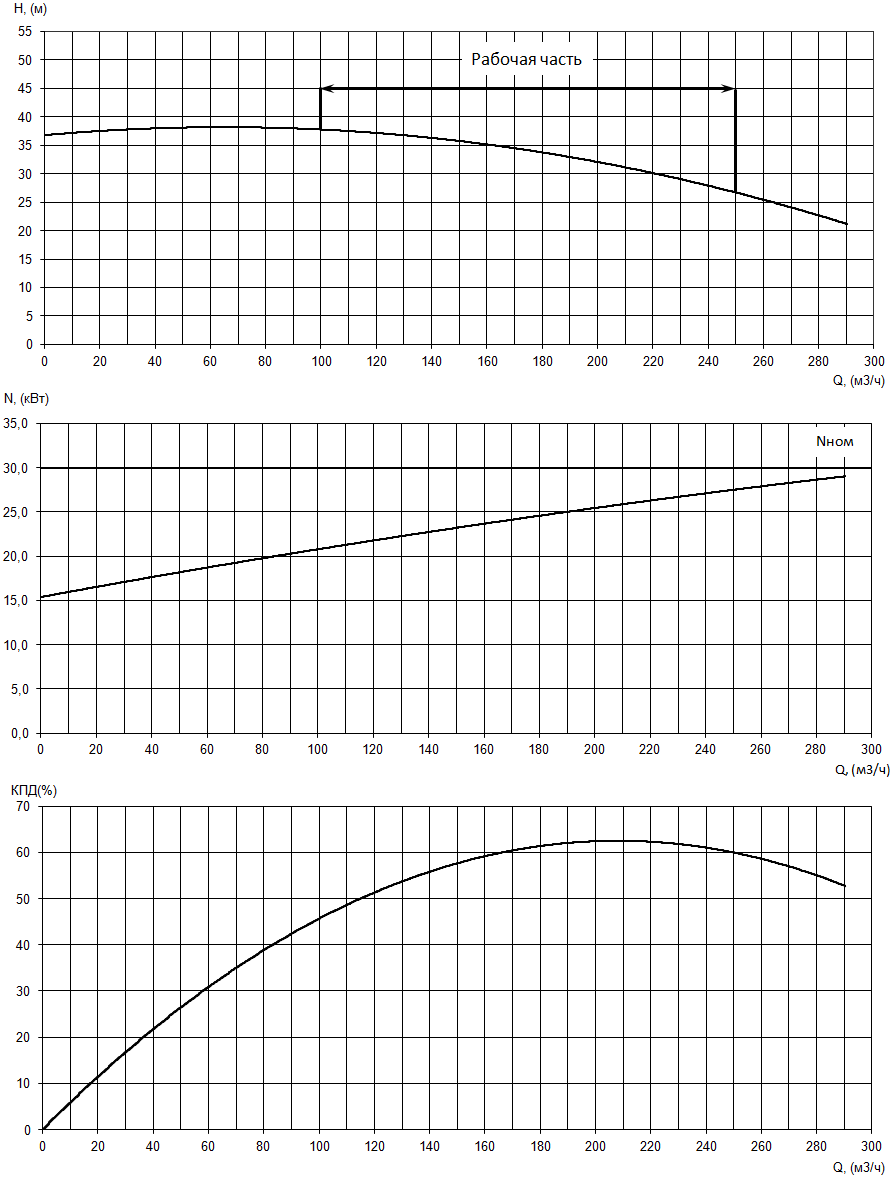 На графике показана зависимость напора, мощности и КПД насоса ЦМЛ 150/315 от расхода. Это основной документ для подбора электронасоса Иртыш ЦМЛ 150/315. Для детального изучения характеристик центробежных насосов рекомендуем ознакомиться с профильной литературой.