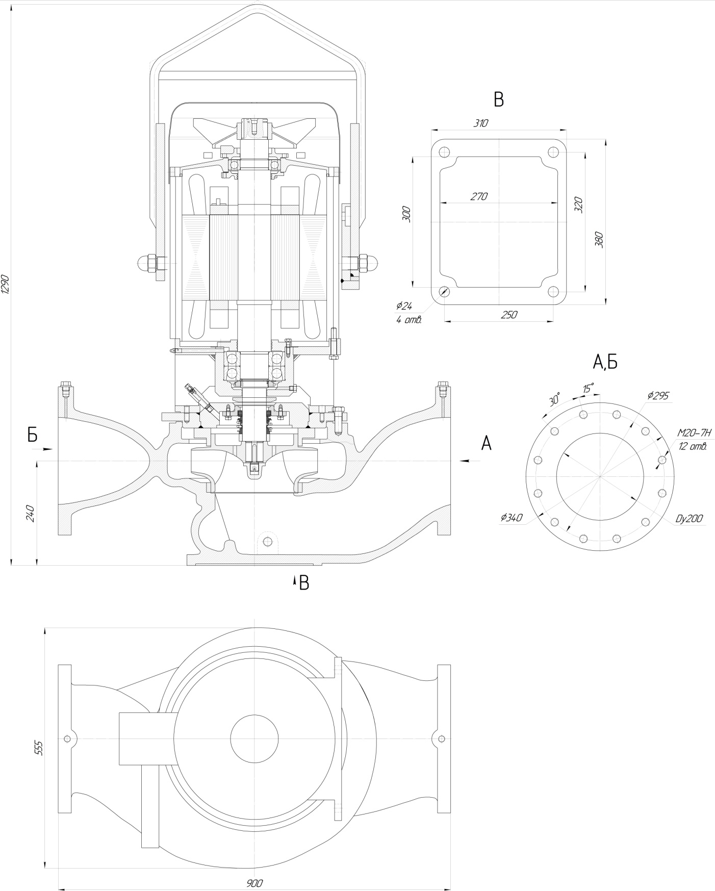 На схеме показан общий вид и монтажные размеры моноблочного насоса ЦМЛ 200/250.290. Эта информация нужна для проектирования фундамента и обвязки трубопроводов насоса Иртыш ЦМЛ 200/250.