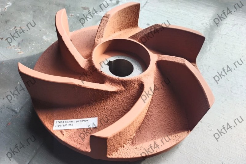 Вихревое рабочее колесо Ø250 мм из серого чугуна представляет собой колесо открытого типа (отсутствует ведомый диск). Предназначено для перекачивания среды с содержанием, в том числе длинноволокнистых частиц. К преимуществам насоса с вихревым рабочим колесом можно отнести следующее: способность перекачивать среды, содержащие длинноволокнистые включения с минимальным риском заклинивания рабочего колеса насоса. К недостаткам можно отнести относительно невысокий КПД по сравнению с канальными рабочими колесами. Средний срок службы колеса – около 2х лет (в зависимости от условий эксплуатации). Применяется в электронасосах ПФс 150/255.250-11/4, РФс 150/255.250-11/4.